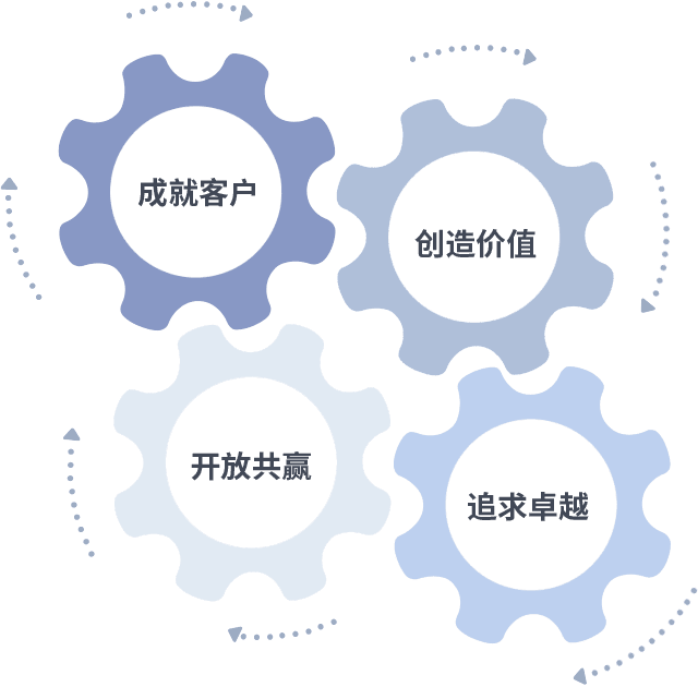 成就客户是一切决策的出发点,,,创造价值是衡量所有工作的标准,,追求卓越是我们做事做人的态度,,开放共赢是我们的格局也是最终的结果。。价值观的齿轮环环相扣,,,推动着组织里的每个人不断向前。。。。