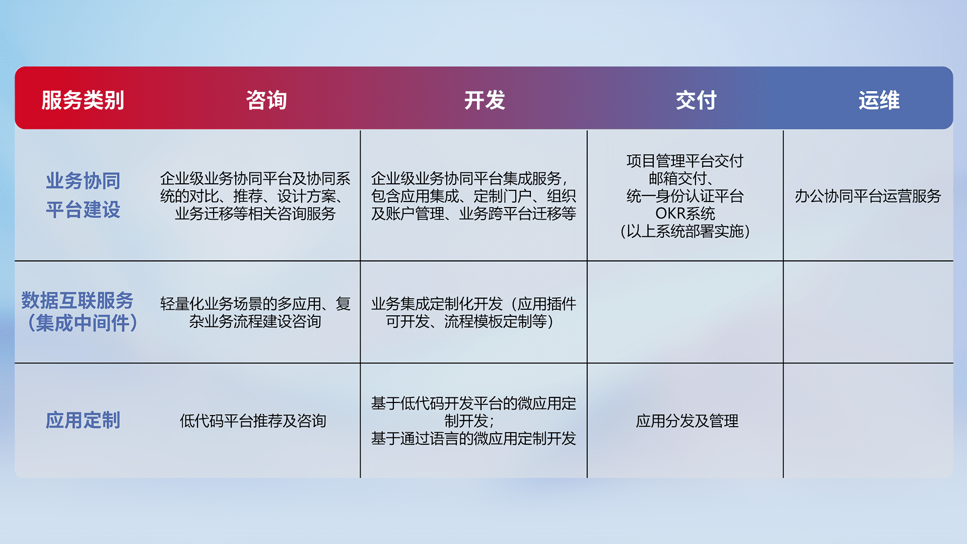 针对钉钉、、、、企微、、、IDaas等平台级产品提供产品的规划、、方案、、交付、、、、定制化开发等服务,,,,实现如统一协同办公、、智能客户服务、、、混合会议管理、、、智能数据查询、、、、等业务场景,,实现数字化转型。。。。