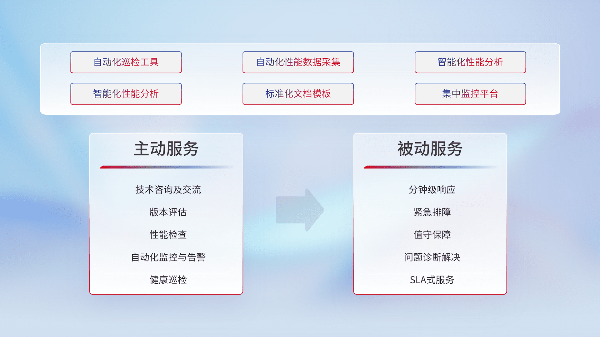 智能化工具和标准化文档,,,保障服务质量,,提供主动服务(包含技术咨询、、、、版本评估、、、、性能检查、、、、自动化监控与告警、、、、健康巡检)和被动服务包含(分钟级响应、、、紧急排障、、值守保障、、、、问题诊断解决、、SLA服务)。。。。