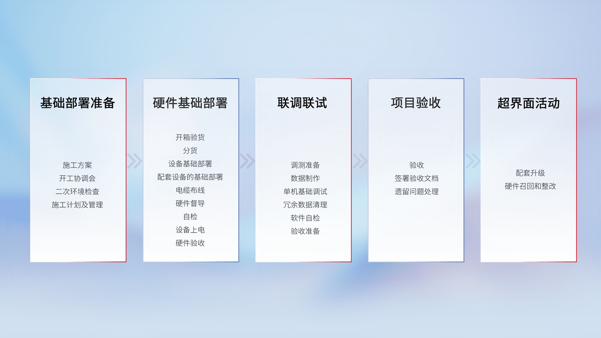 从基础部署准备、、、硬件基础部署、、联调联试、、、、项目验收、、、越界面活动的全过程可追溯,,,保证施工质量和进度。。。。
